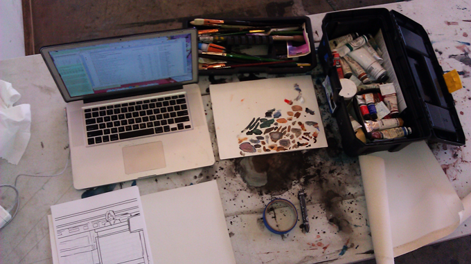Above is a picture of my supplies at a table in a painting room. There’s my palette, laptop, canvases, and awesome toolbox of painting stuff. Getting a toolbox from Home Depot was the best investment ever. Not really, but that’s what I mean. I can even sit atop it if it gets crowded on the bus.
